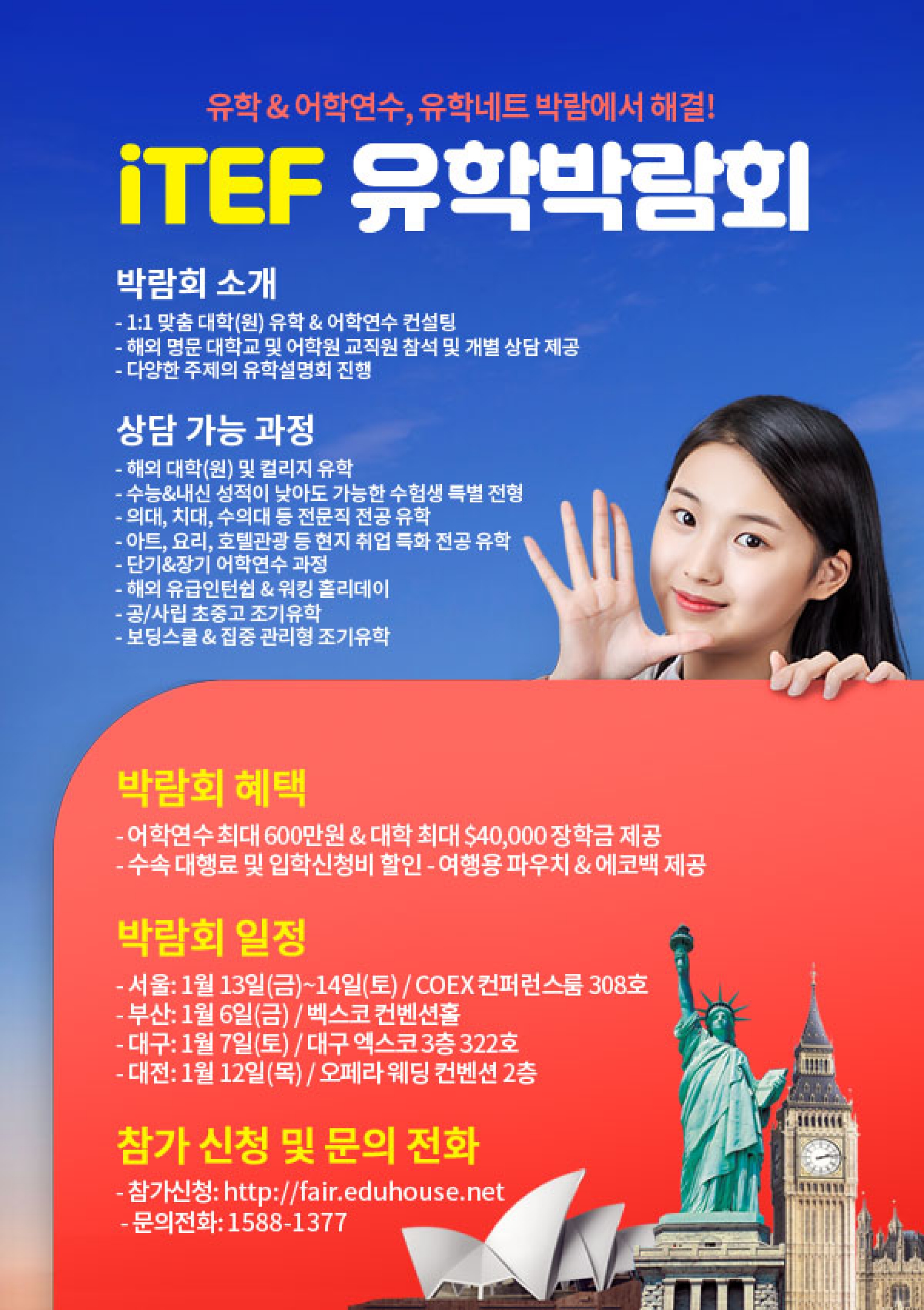 여러분 안녕하세요 유학 박람회 일정을 확인했어요?설마 모르는 것은 아니겠죠!?유학을 준비하고 있다면 꼭 반드시 참여하다 않으면 안 된다는 유학 설명회!전문 강사진과 유학 컨설턴트가 할 시간 고급 정보와 유학 시험 요령까지 모두 공개한다는 사실!이번 학카즈 유학 박람회에서 열리는 미국 명문 대학 합격생 학카즈 동창생의 TOEFL/GRE시험 공략 칩과 석사·박사 유학 박람회까지 금방 알립니다!!석사·박사 유학 박람회에서 강연한 미국 명문대 합격자의 유학 준비의 성공 비결이야!맘에 안 됩니까?