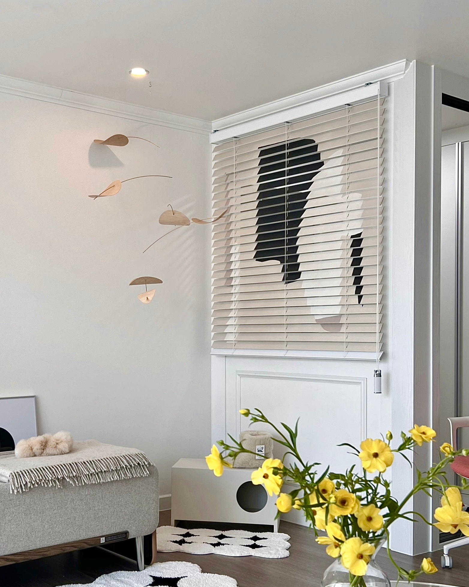 양면으로 사용이 가능하기 때문에 이렇게 슬랫을 뒤집으면 화이트우드 블라인드로 사용할 수 있습니다. 태양이 강렬해서 프린트가 보이는데 밤에는 완전 화이트우드블라인드에요~